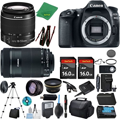 Canon EOS 80D Camera + 18-55mm IS STM + 55-250mm STM + 2pcs 16GB Memory + Case + Memory Reader + Tripod + ZeeTech Starter Set + Wide Angle + Tele + Flash + Battery + Charger