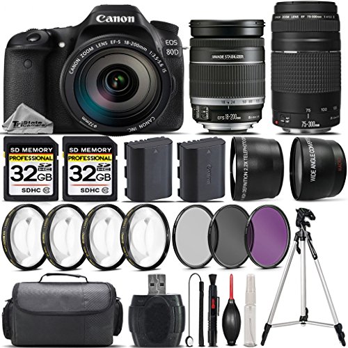 Canon EOS 80D DSLR Camera + Canon 18-200mm IS Lens + Canon 75-300mm Lens + 0.43X Wide Angle Lens + 2.2x Telephoto Lens + 64GB Storage + 4PC Macro Kit + UV-CPL-FLD Filters - International Version
