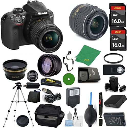 Nikon D3400 DSLR - International Version (No Warranty), 18-55mm f/3.5-5.6 DX VR, 2pcs 16GB Memory, Camera Case, Wide Angle, Telephoto, Flash, Battery, Charger