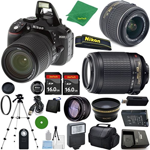 Nikon D5300 International Version - No Warranty, 18-55mm f/3.5-5.6 DX VR, Nikon 55-200mm f4-5.6G VR Nikkor, 2pcs 16GB ZeeTech Memory, Case, Wide Angle, Telephoto, Flash