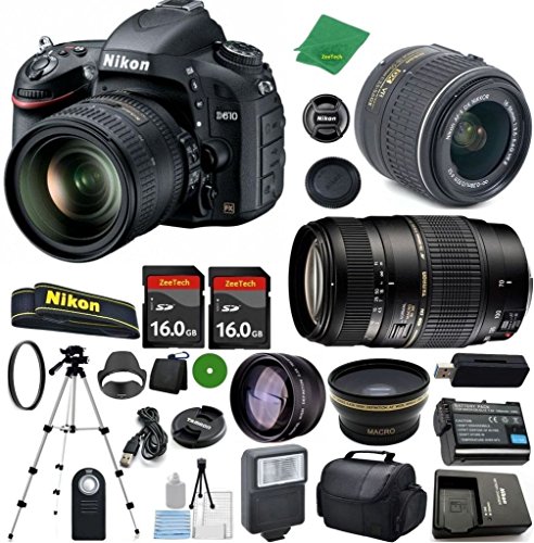 Nikon D610 DX-Format CMOS DSLR Digital Camera Body, NIKKOR 18-55mm f/3.5-5.6 AF-S DX VR, Tamron 70-300mm DI LD Zoom, 2pcs 16GB ZeeTech Memory, Case, Wide Angle, Telephoto, Flash