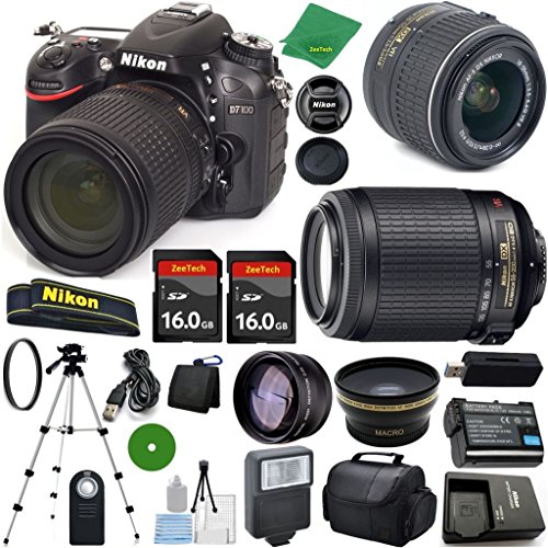 Nikon D7100 International Version - No Warranty, 18-55mm f/3.5-5.6 VR, Nikon 55-200mm f4-5.6G ED VR Nikkor, 2pcs 16GB ZeeTech Memory, Case, Wide Angle, Telephoto, Flash